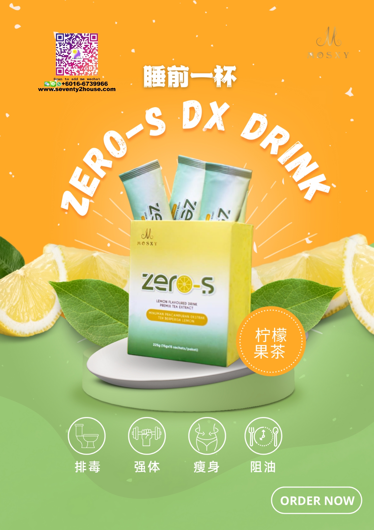 ZERO-S 采用了益生元和益生菌,有助于洁净,修复以及增强整个肠道功能。 此外, 能够促进肠道蠕动,舒缓便秘,改善肠道生态,维持肠道健康环境。ZERO-S 是一种清爽的柠檬果茶口味, 酸甜可口, 不浓稠,人人皆喜爱的天然可口饮品。ZERO-S is an all-natural digestive wellness kit which is developed and formulated in North America . It contains 100% natural and fresh ingredients .it combined 4 powerful effects of slimming, detoxification , maintain strong body and build perfect body line.It formulated with probiotics and prebiotic to eliminate toxins inside our body totally by promoting gastrointestinal motilty and bowel movementZERO-S is a refreshing lemon fruit tea taste, sweet and sour, not thick, and a natural and delicious drink that everyone loves.主要成分:Main ingredients:1)檸檬果汁粉Lemon juice power-有助於排毒和促進自然消化健康, 提升免疫能力。-Helps detoxify body and promotes natural digestive health. Boosts up immunity system.2)菇萃取精华(菇类甲壳素) Mushroom extract (Contain Chitinglucan)- 菇類萃取物是取自於金針菇.丰富的铁质和纤维质能有效地促进新陈代谢,平衡胆固醇代谢。最重要的是能有效的强化消化系统,增强肠胃能量促进蠕动,并预防肝脏和肠胃道的疾病。-Chitinglucan is derived from the edible enokitake mushroom.Rich in iron and fiber can effectively promote metabolism and balance cholesterol metabolism. The most important thing is to effectively strengthen the digestive system, enhance gastrointestinal energy, promote peristalsis, and prevent liver and gastrointestinal diseases3)左旋肉碱(柠檬、鳄梨、芦荟萃取)L-Carnitine (Lemon, Avocado, Aloe Vera Extract)- 植物中萃取的丰富左旋肉碱能有效的代谢体内多余脂肪,并将脂肪转化为体内所需的能量。- The rich L-carnitine extracted from plants can effectively metabolize excess fat in the body and convert fat into energy needed by the body.4)白芸豆萃取精华White Kidney bean extract- 丰富的白芸豆精华含有阻断淀粉分解和消化蛋白质 。这种蛋白质有助于充当碳水化合物吸收阻滞剂。减少饭后血糖和胰岛素峰值- The rich white kidney bean extract contains a protein that blocks the breakdown and digestion of starch . This protein may act as carbohydrate absorption blocker . Reduce blood sugar and insulin spikes after meals .5)塞纳叶萃取精华Senna leaf extract- 塞纳叶能有效地提升大肠细胞的蠕动功能并改善便秘的状况,并对于有痔疮的人能起到止血和杀菌的功效。- Senna leaves can effectively improve the peristaltic function of large intestinal cells and improve constipation, and can stop bleeding and sterilize people with hemorrhoids.6)藤黄果萃取精华Garcinia cambogia extract- 藤黄果果皮大量的羟基柠檬酸(HCA)能有效的将碳水化合物转化为能量产生而不是作为体脂累积。HCA也可以帮助热量消耗和燃烧脂肪- The large amount of hydroxycitric acid (HCA) in Garcinia cambogia peel diverts carbohydrate into energy production rather than accumulating as body fat. HCA can also help with calorine consumption and fat burning.7)菊粉Inulin菊粉是來自單糖植物源的碳水化合物,它能夠製造低聚醣。菊粉作為益生元,它刺激腸道益菌的生長,給予我們健康的結腸。-Inulin is a type of carbohydrate from a plant source with monosaccharides, linked together to create oligosaccharides.As a prebiotic, Inulin stimulates the growth of friendly and healthy intestinal bacteria which supports good colon health.8)乳双歧杆菌Bifidobacterium lactis- 活性的益生菌能有效的调节肠道的细菌功能,改善肠胃的功能,促进肠道蠕动功能及软化排泄物预防便秘的状况发生。以达到提升免疫力,抗炎和抗氧化的功效。- Active probiotics can effectively regulate intestinal bacterial function, improve gastrointestinal function, promote intestinal peristalsis and soften excrement to prevent constipation. To achieve immunity-boosting, anti-inflammatory and antioxidant effects.18大主要功效:18 of benefits:-舒缓便秘reliefs constipation-提高消化功能Improve digestion-提升肌肤条件Enchances skin condition-增强免疫功能Reinforces immune function-增强肠胃所需的益生菌Increase probiotics needed by the stomach-补充大肠所需的能量Supply energy needed by the large intestine-促进脂肪代谢和乳化Promotes fat metabolism and emulsification-改善胃涨风Improve stomach bloating-提升身体的排汗功能Improve the body's perspiration function-燃烧多余脂肪burn excess fat-抑制脂肪合成Inhibit fat synthesis-代谢多余脂肪Metabolize excess fat-降低有害胆固醇Lower bad cholesterol-抗水肿消炎Anti-edema and anti-inflammatory-抗糖效果Anti-sugar effect-改善胃部过敏Improve stomach allergies-延迟老化Delays the onset of ageing-收紧小腹Flat tummyZERO-S APPROVED BY KKMZERO-S 拥有大马卫生部认证使用方法:打开1小包混合在100-150ml 温水中,摇匀并立即饮用 。每天睡前饮用一包。Direction of use :Mix 1 sachet in 100-150 ml of lukewarm water. Stir well and enjoy your drink.Consume before bedtime .温馨提示:Warm reminder:一天必须饮用2公升的水以达到最佳效果 。 疾病者或孕妇必须通过医生建议才可饮用。Must drink at least 2 liters of water for better results.sick individual and pregnant women must get medical advise before drinking.存储建议:Storage:存放在阴凉和干燥地方,避免阳光直接照射。Keep in a cool dry place. Avoid direct exposure to sunlight.